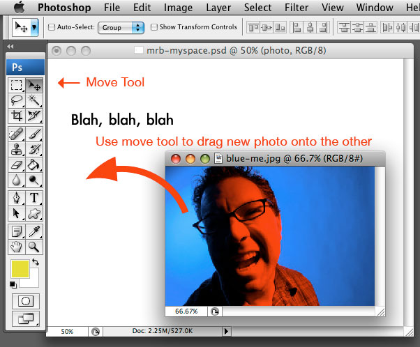 can also use the move tool to move text and photos around on the