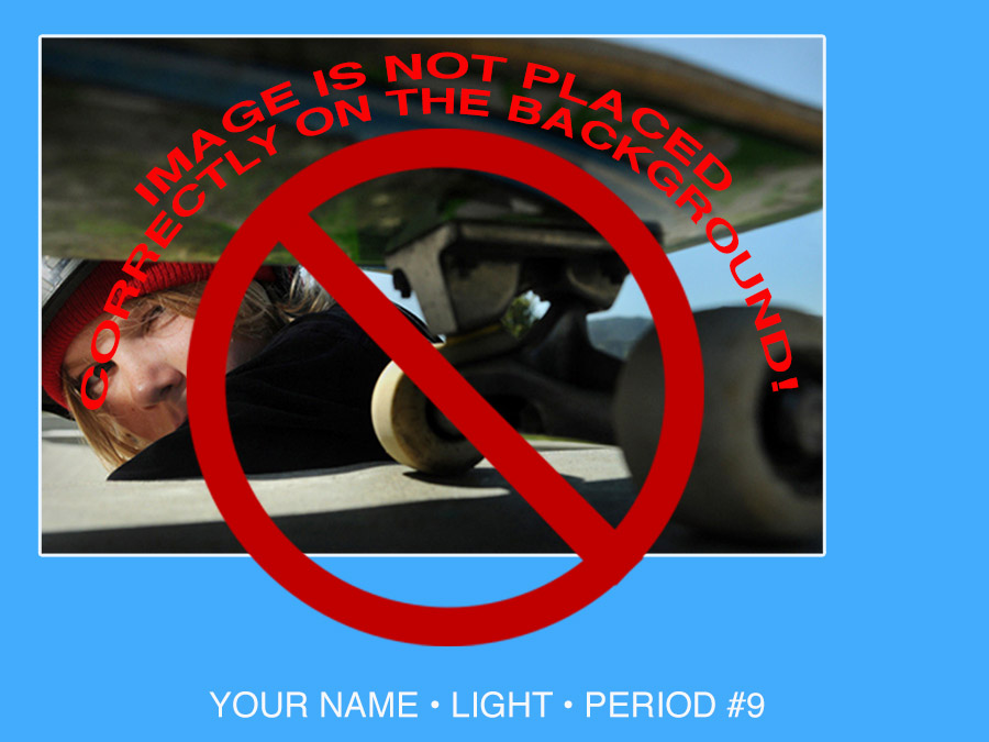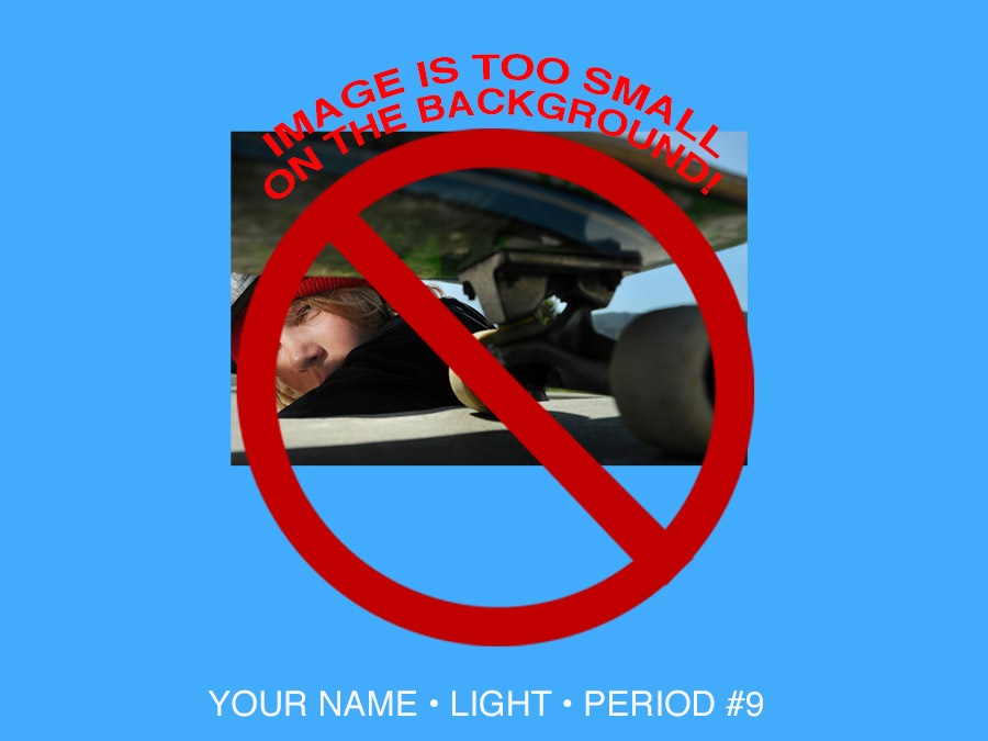 •IN THE EXAMPLE BELOW, THE IMAGE IS TOO SMALL ON THE BACKGROUND -IT'S A PHOTO ASSIGNMENT, THE PHOTOS SHOULD BE DOMINANT (VERY LARGE) ON THE BACKGROUND.