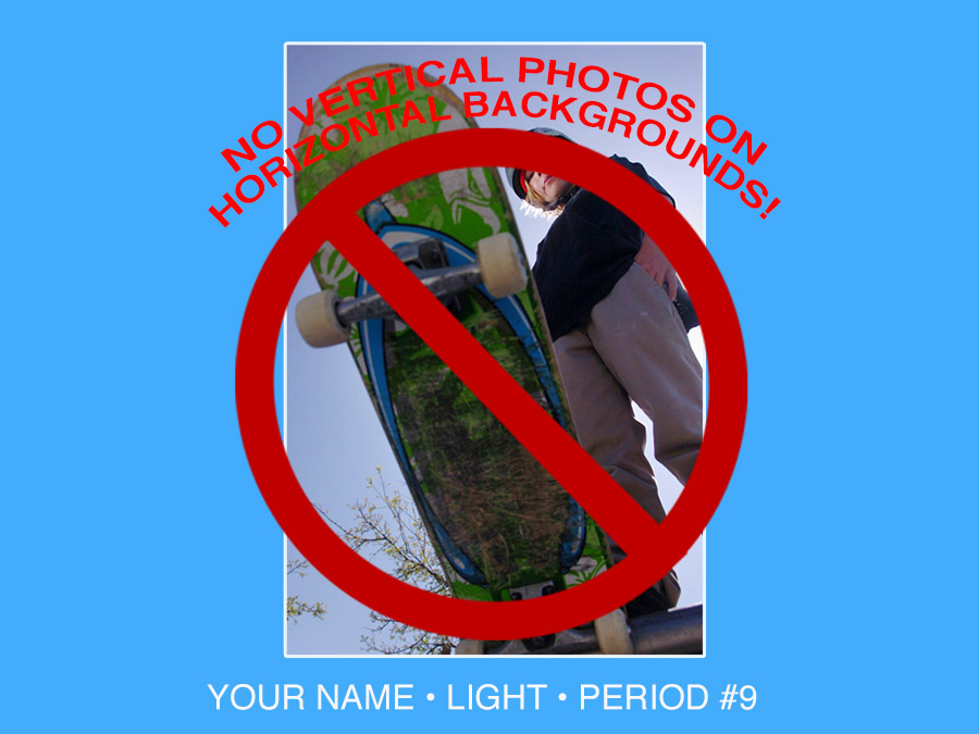 •IN THE IMAGE BELOW, THE PHOTO IS ON THE INCORRECT BACKGROND. VERTICAL PHOTOS SHOULD BE PLACED ON VERTICAL BACKGROUNDS -PLACING THE PHOTO ON THE CORRECT SHAPE BACKGROUND IT MAKES THE PHOTO BIGGER AND IT BECOMES THE FOCAL POINT OF THE PRESENTATION,RATHER THAN THE BACKGROUND.
