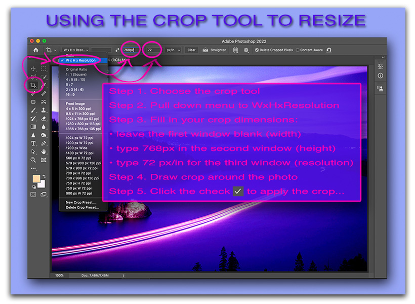 •Step 3 -Before placing your images on the background, resize each photo to 768 pixels high using the crop tool... (doing this will make it easier to fit all you photos on the background).