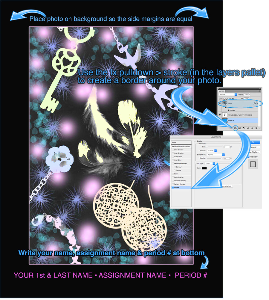 •IN THE EXAMPLE BELOW, THE IMAGE IS TOO SMALL ON THE BACKGROUND -IT'S A PHOTO ASSIGNMENT, THE PHOTOS SHOULD BE DOMINANT (VERY LARGE) ON THE BACKGROUND.