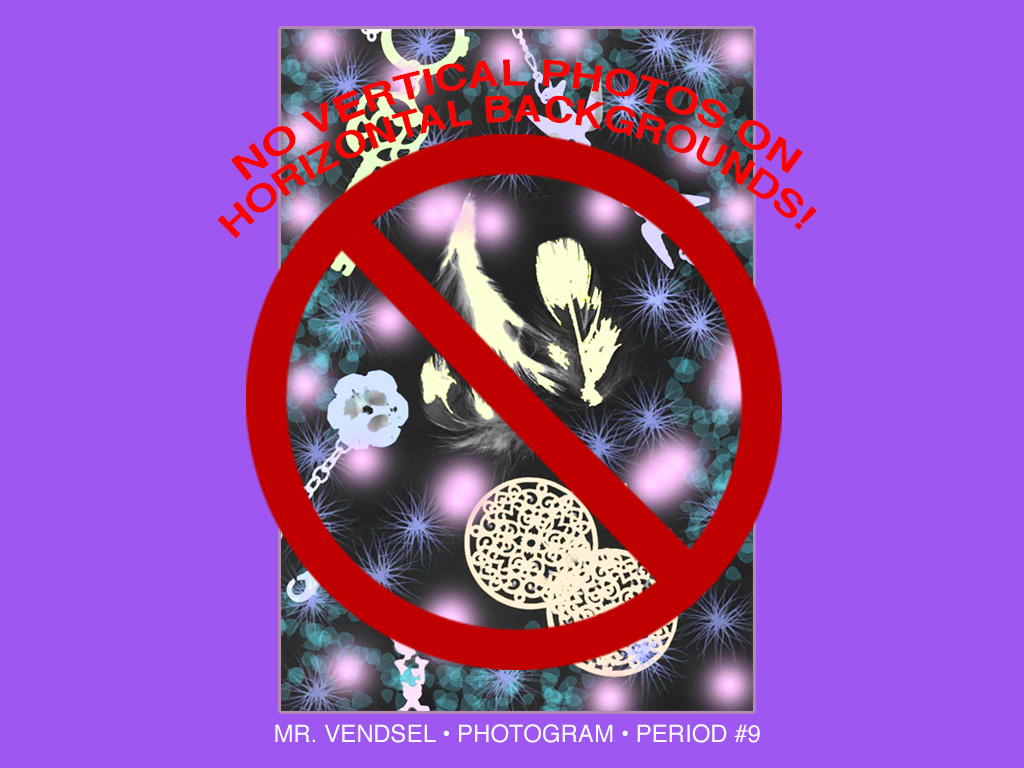 •IN THE IMAGE BELOW, THE PHOTO IS ON THE INCORRECT BACKGROND. VERTICAL PHOTOS SHOULD BE PLACED ON VERTICAL BACKGROUNDS -PLACING THE PHOTO ON THE CORRECT SHAPE BACKGROUND IT MAKES THE PHOTO BIGGER AND IT BECOMES THE FOCAL POINT OF THE PRESENTATION,RATHER THAN THE BACKGROUND.